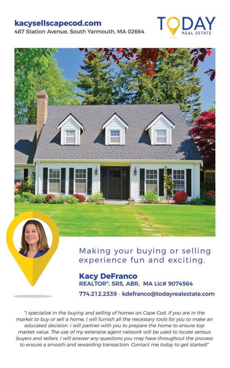 NONMEDICAL IN-HOME CARE Our Care In Home Services ............ 21 PHOTOGRAPHY Sweet Connolly Photography.......... 15 POST CONSTRUCTION CLEANING Duarte’s Cleaning ...................... 15 PUBLIC ADJUSTERS Dillon Public Adjusters Inc .............. 3 REAL ESTATE Kathy Mischik - Jack Conway .......... 25 Kacy DeFranco - Today Real Estate .... 19 REAL ESTATE ATTORNEYS S David White PC ....................... 11 REALTY & INVESTMENTS Burns Realty & Investments............. Front Inside Cover RESIDENTIAL & COMMERCIAL PAINTERS CertaPro Painters of the South Shore and Boston Areas ....................... 9 TOURISM See Plymouth .......................... 13 TRANSPORTATION Daddio LLC................Front Cover, 16-17