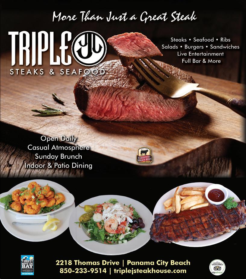 TripleJSteakhouse.com F-9 Triple J Steaks & SeafoodSCAN ME VIEW FULL MENU, READ REVIEWS, & MUCH MORE! Average Price: $25-$35 Pet Friendly • Live Music Delivery • Outdoor Seating Allergen Menu Options Service: Lunch / Dinner Full Service Bar Happy Hour: N/A Open Mon - Thur 11am to 9pm Fri - Sat 11am to 10pm Sundays 9am to 9pm (850) 233-9514 2218 Thomas Drive Panama City Beach, FL 8 8