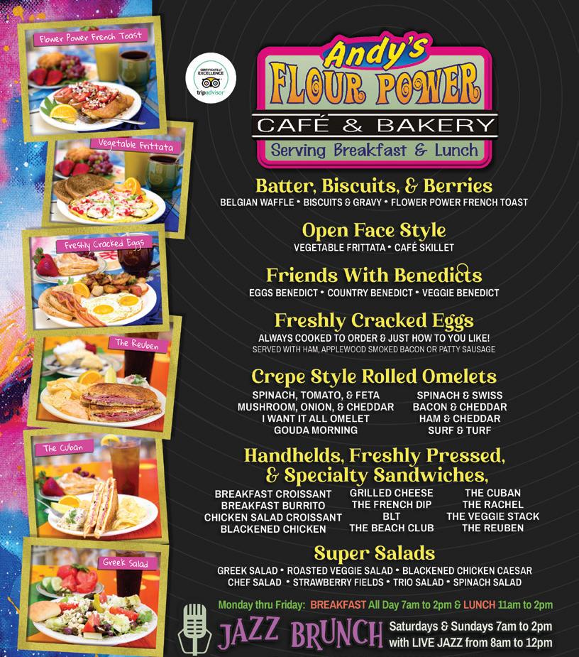 SCAN ME VIEW FULL MENU, READ REVIEWS, & MUCH MORE! Open Breakfast: Mon-Fri 7am to 2pm Lunch: Mon-Fri 11am to 2pm Brunch: Sat & Sun 7am to 2pm Average Price: Under $15 Pet Friendly • Live Music Delivery • Outdoor Seating Allergen Menu Options Service: Breakfast / Brunch / Lunch Full Service Bar Happy Hour: N/AF-9 AndysFlourPower.com (850) 230-0014 2629 Thomas Drive Panama City Beach, FL 32408 Andy’s Flour Power Café 5 5