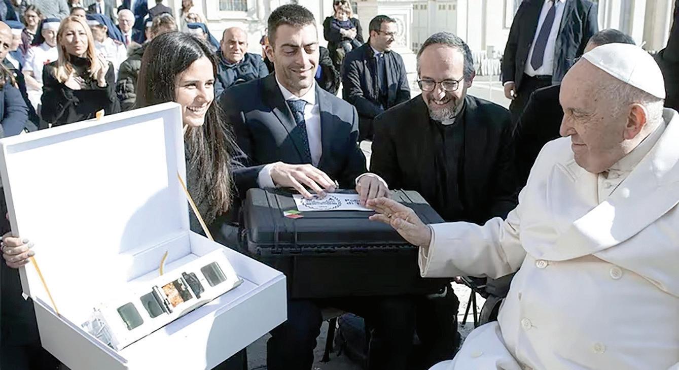 La oración de Francisco se condensa en un nano-libro digital producido por el Consejo Nacional de Investigación que consiste en una lámina de silicio de 2x2x0,2 milímetros en la que se han impreso las imágenes, los discursos y las lecturas que el 27 de marzo de 2020, en plena pandemia, recitó Francisco en aquel impactante momento de oración bajo una incesante lluvia.