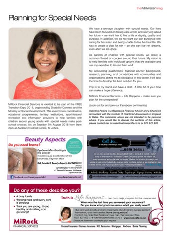Planning for Special Needs We have a teenage daughter with special needs. Our lives have been focused on taking care of her and worrying about her future – we want her to live a life of dignity, quality and purpose. In addition, we do not want our son burdened with caring for his sister and being unable to live his best life. We had to create a plan for her – so she can live her dreams, even after we are gone. As parents of children with special needs, we share a common thread of concern around their future. My vision is to help families with individual options that are available and use my expertise to lessen their load. My accounting qualification, financial adviser background, research, planning, and connections with communities and organisations allows me to specialise in this sector. I will take the time to develop the best solution for you. Pop in to my stand and have a chat. A little bit of your time can make a huge difference. MiRock Financial Services – Life Happens – make sure you plan for the unexpected! MiRock Financial Services is excited to be part of the FREE Transition Expo 2018, organised by Disability Connect and the Ministry of Social Development. This event hosts coordinators, vocational programmes, tertiary institutions, sport/leisure/ recreation and information providers to help families with children and/or young adults with special needs make postschool choices. It’s on Tuesday 7th August 2018 from 9am2pm at Auckland Netball Centre, St Johns.