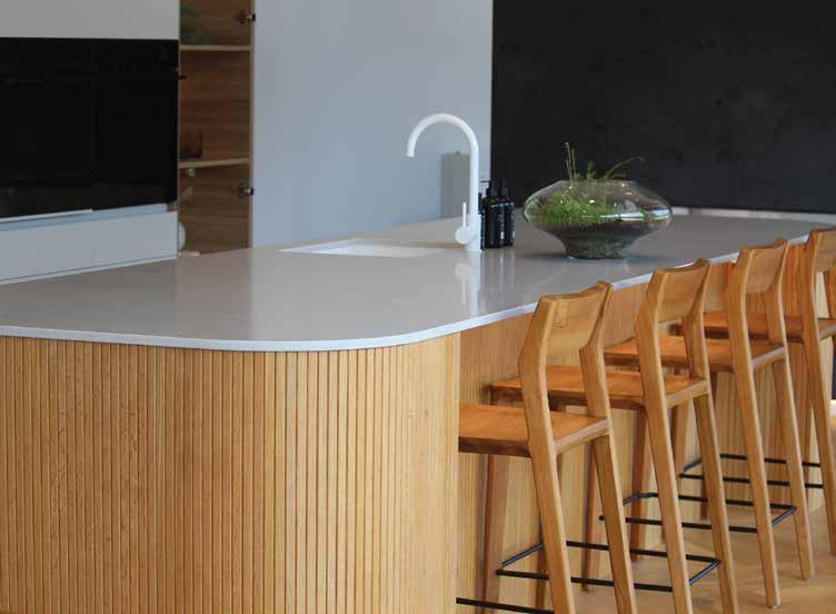 Decorating the home Maddren needed to showcase many different products and finishes, but bring them all together cohesively. ‘We started old school with mood boards and brainstorming ideas,’ says Keegan. ‘We’ve got five different claddings and all sorts of finishes going on, so we brought Natasha from DESIGNNS on board to help us create that wow when you walk in. Several rooms have their own personality but there’s a natural palette and re-occurring elements that unify it all. And curves – there are a lot of curves in this home!’