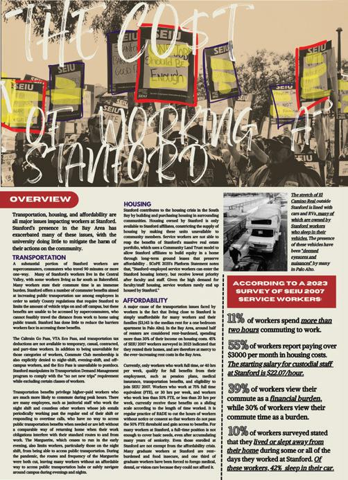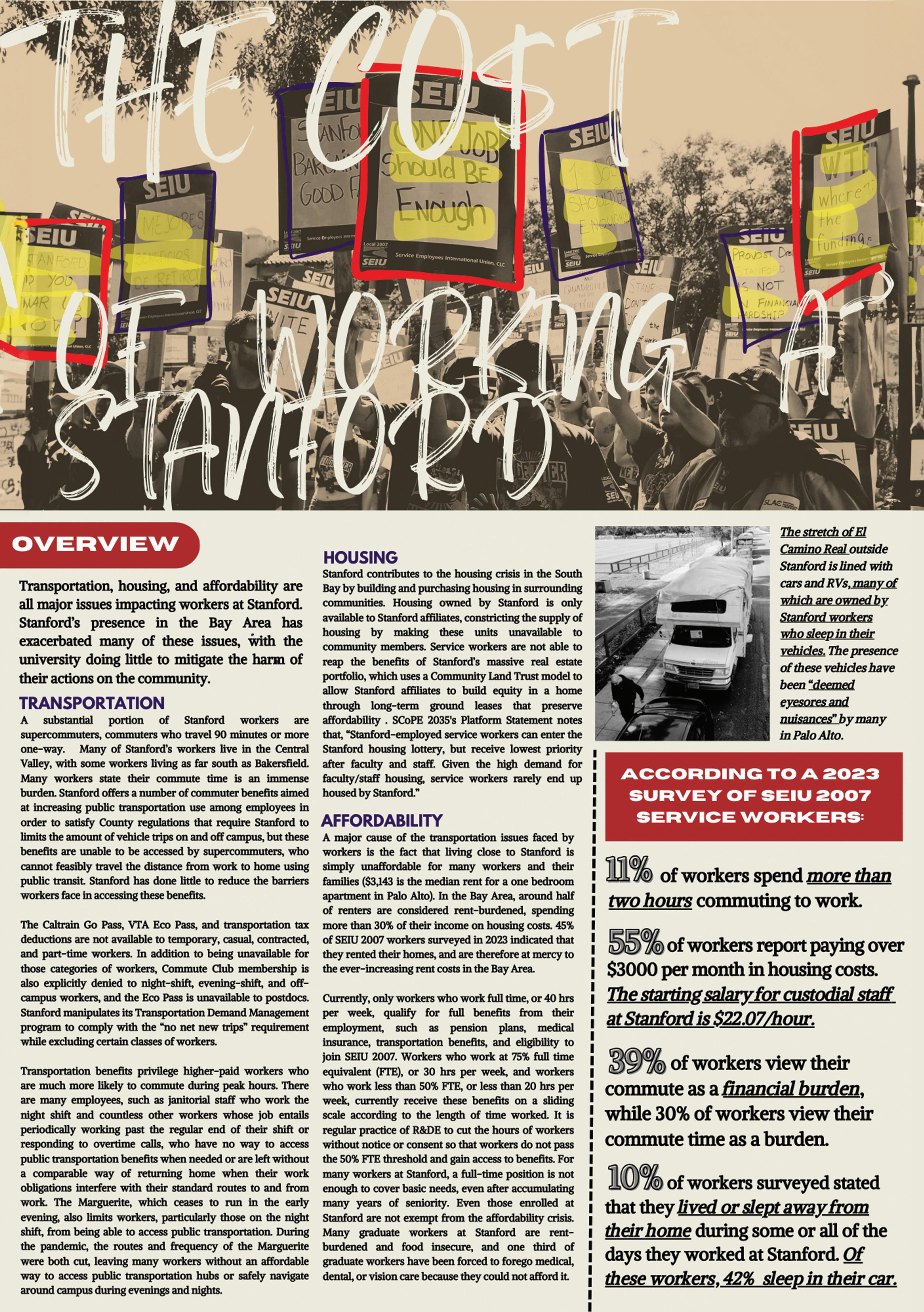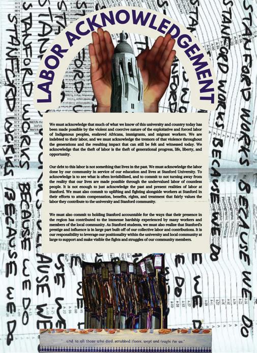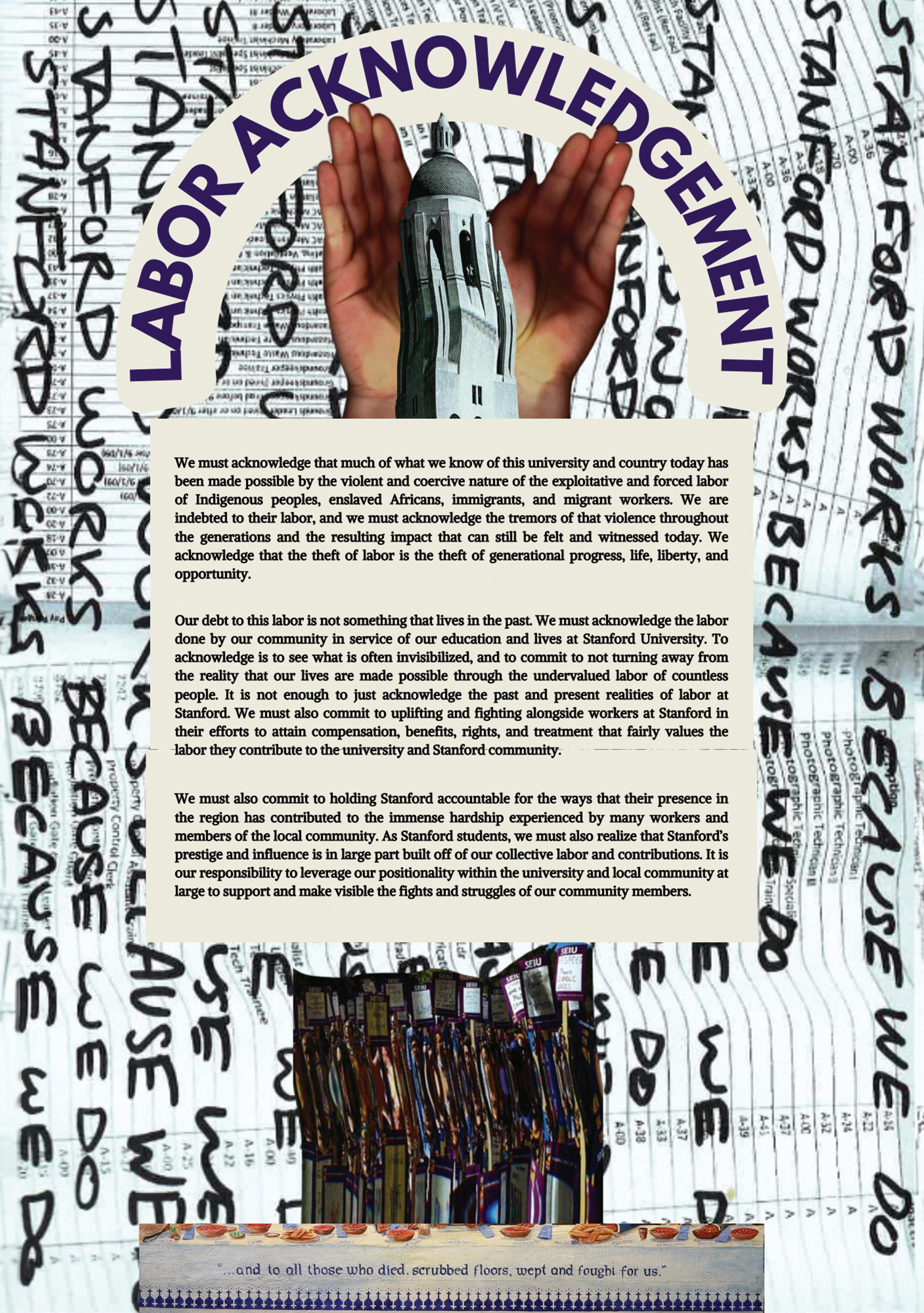 The primary purpose of this piece is to foster and provoke critical thought and discussion around the role of labor at Stanford and create visibility around the conditions experienced by service workers, whose labor at Stanford is often invisibilized. Through combining text with collaged visual imagery, the piece intends to both inform and call its audience to action regarding the struggles experienced by workers at Stanford.