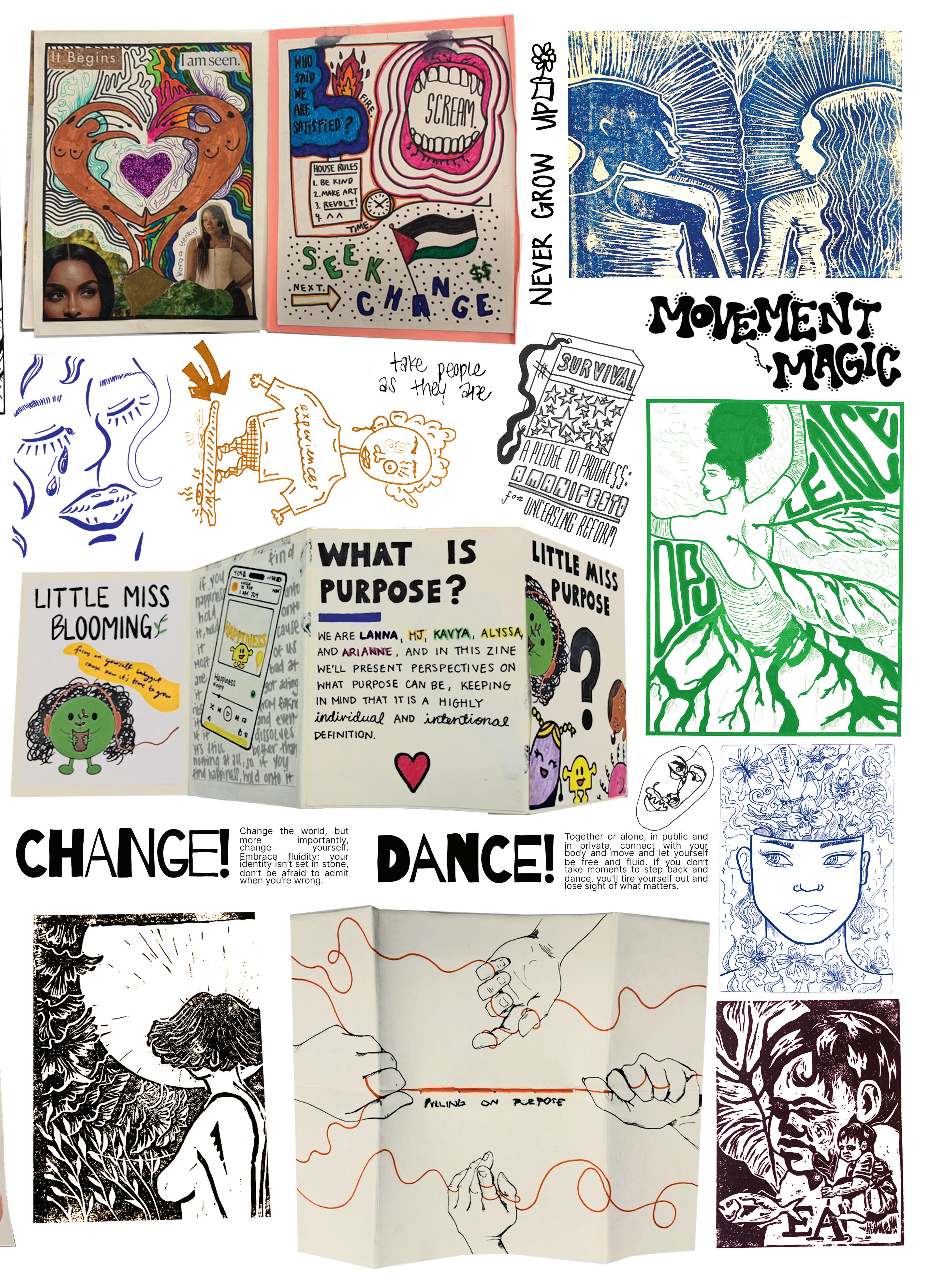 PRINT ON PURPOSE was a course hosted in Stanford University’s d.school Fall of 2023. It investigates how social justice is imprinted in our local, national, and global consciousness. Students learned about historical and contemporary contexts, from Noname Book Club to Emory Douglas’s prints for the Black Panther Party, and social movements that leverage print, as well as printed-matter production methods.