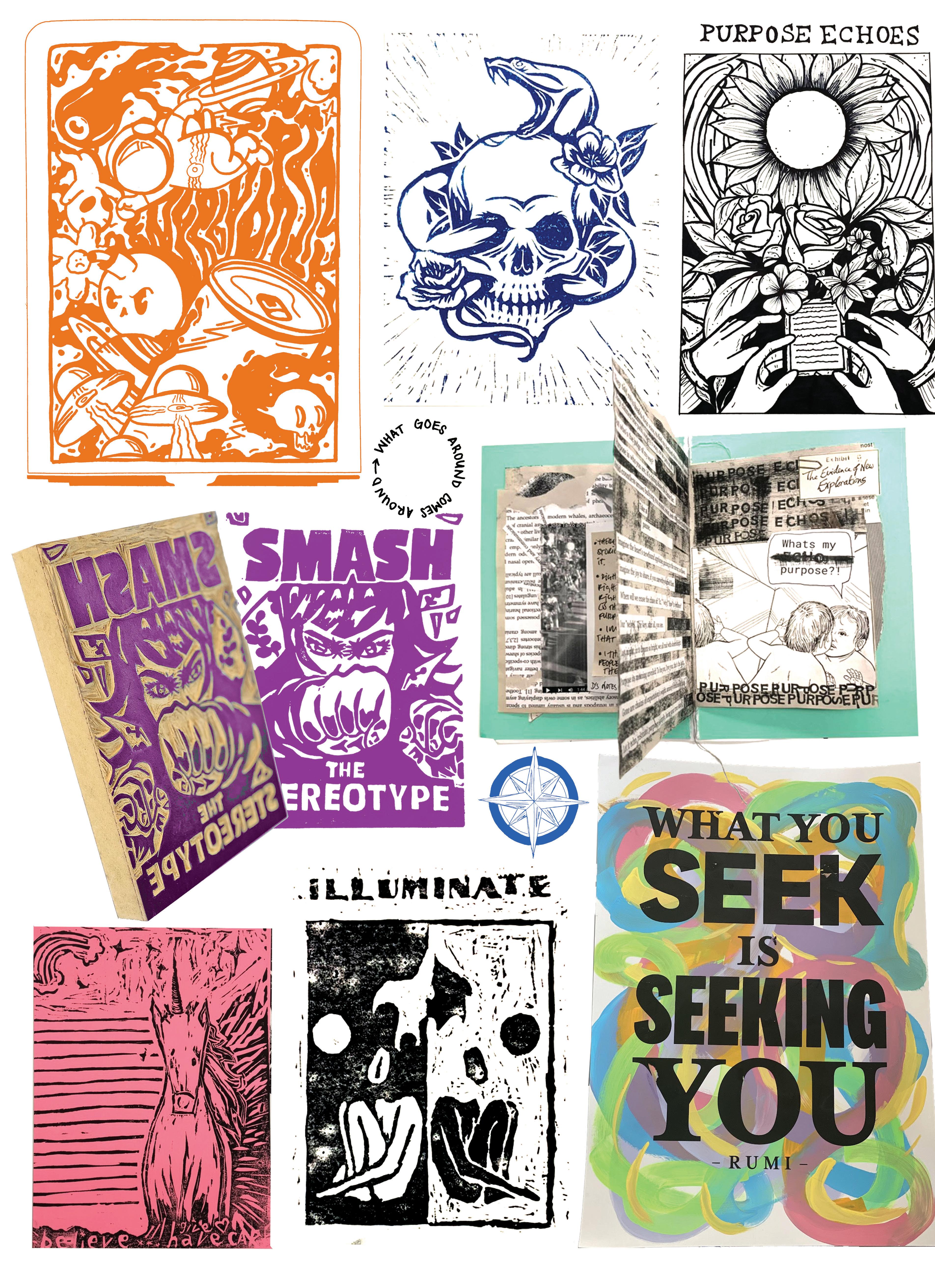 NOTE: The artwork and accompanying statements featured in this publication are the sole creations of the individual students. They do not reflect the views or opinions of Print on Purpose, the d.school, Stanford University, or any associated organizations. This publication is intended to showcase the creative efforts of students and the conversations that are important to them. The content in these works is provided "as is;" no representations are made that the content is error-free.