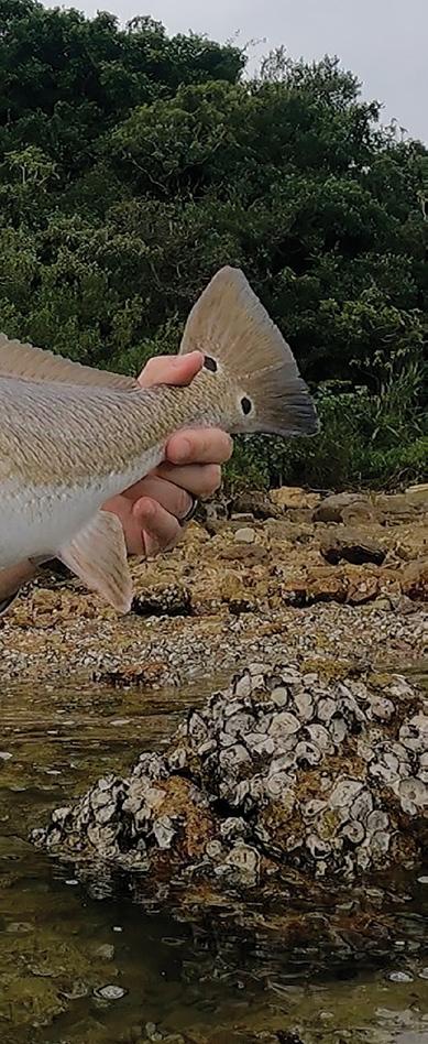 I use a very basic setup: a Redington Wrangler Salt 8-weight, floating line with a 10-foot 20lb tapered fluorocarbon leader. I’m really into saltwater fly fishing now, so I have a long shopping list of new gear I need to purchase. The flies, though, are where the magic happens. I get my flies from Biohazard Flies ( instagram. com/biohazardflies ), tied by a great friend of mine, Karl, who makes all my flies. I think he’s really the pioneer of trying to catch redfish in Hong Kong with a fly rod, which isn’t an easy feat to achieve. He’s pointed me in the right direction with technique, tackle and, with my previous conventional fishing redfish knowledge and experience, I have been quite successful. I give him a lot of credit. Picking the right flies for Hong Kong redfish is still very much in the experimental stage, but so far, we’ve had a lot of success with a variation of the Redfish Crack flies. As I said, it’s highly experimental, and we’re still trying to nail down what they really want to see. For example, they’ll absolutely smash a white 3-inch soft plastic paddle tail any day, but I tried a white fly consistently for a few months, and nothing happened. So, it’s very much trial and error.