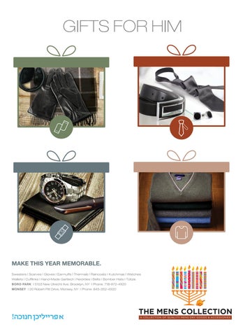 MAKE THIS YEAR MEMORABLE. Sweaters | Scarves | Gloves | Earmuffs | Thermals | Raincoats | Kutchmas | Watches Wallets | Cufflinks | Hand-Made Gartlech | Neckties | Belts | Bomber Hats | Tzitzis BORO PARK | 5103 New Utrecht Ave. Brooklyn, NY | Phone. 718-972-4920 MONSEY | 20 Robert Pitt Drive, Monsey, NY | Phone. 845-352-4920