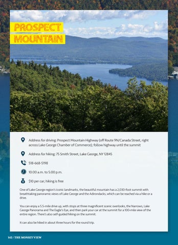 Address for driving: Prospect Mountain Highway (off Route 9N/Canada Street, right across Lake George Chamber of Commerce); follow highway until the summit Address for hiking: 75 Smith Street, Lake George, NY 12845 518-668-5198 10:00 a.m. to 5:00 p.m. $10 per car; hiking is free One of Lake George region’s iconic landmarks, the beautiful mountain has a 2,030-foot summit with breathtaking panoramic views of Lake George and the Adirondacks, which can be reached via a hike or a drive. You can enjoy a 5.5-mile drive up, with stops at three magnificent scenic overlooks, the Narrows, Lake George Panorama and The Eagle’s Eye, and then park your car at the summit for a 100-mile view of the entire region. There’s also self-guided hiking on the summit. It can also be hiked in about three hours for the round trip.