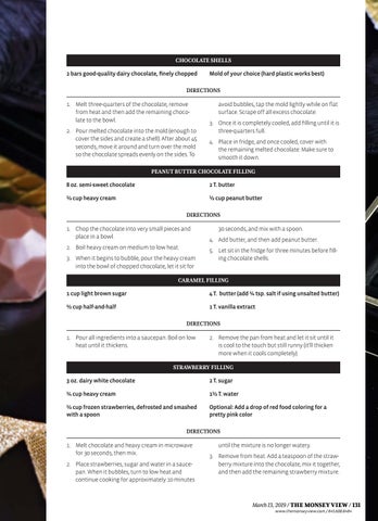 30 seconds, and mix with a spoon. 4. Add butter, and then add peanut butter. 5. Let sit in the fridge for three minutes before filling chocolate shells.