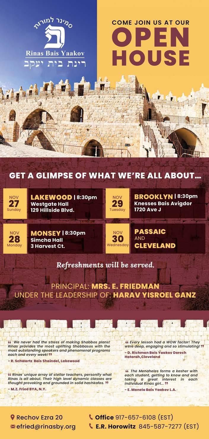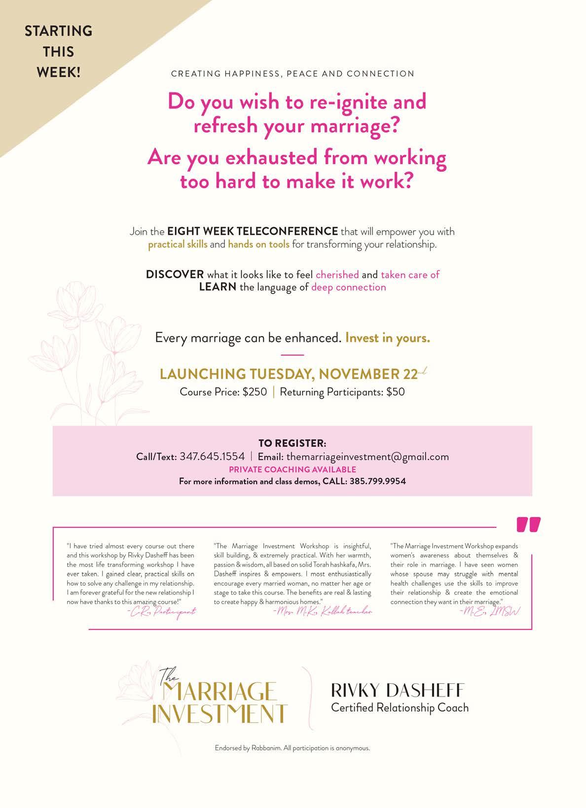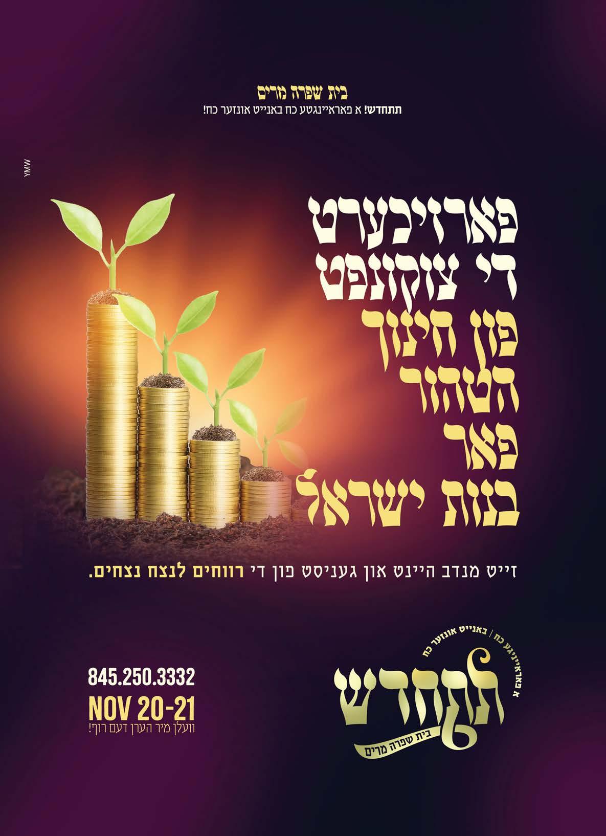 And dear yiddishe mother. Give your daughter the gift of a lifetime of happiness & תיב םולש with the marriage summit, 18 life changing classes with top marriage experts. For less than the price of a תוכרב עבש outfit, have the peace of mind knowing that your daughter has the tools, הפקשה & resources to be happily married. Call 929-286-9900 #2 or www. chanyfelberbaum.com