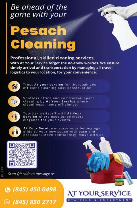 FREE ISSUE 442 MARCH 27, 2024 וצ תשרפ ד”פשת ’ב רדא ז”י SpringArrivals FULLY STOCKED SEE BACK PAGE FOR MORE INFORMATION 213 ROUTE 59, SUFFERN 845.940.7000 EXTENDED HOURS ALL SEASON LONG A CHIC WOMEN’S BOUTIQUE FYI: MOPS The Monsey View’s Spanish-English CLEANING GUIDE GOOD AS NEW These cleaning products are part of the family MRS. CLEAN With the cleaning lady shadchan, help is just a phone call away COUNTDOWN TO CLEAN: WEEK 1! Your how-to guide for every room SWEET MOTHERHOOD IS BACK! Get your kids to clean — with a smile WHAT’S YOUR FAVORITE PRODUCT FOR GREEN CLEANING? 845.622.1111 Call & Text SEE RESPONSES INSIDE!