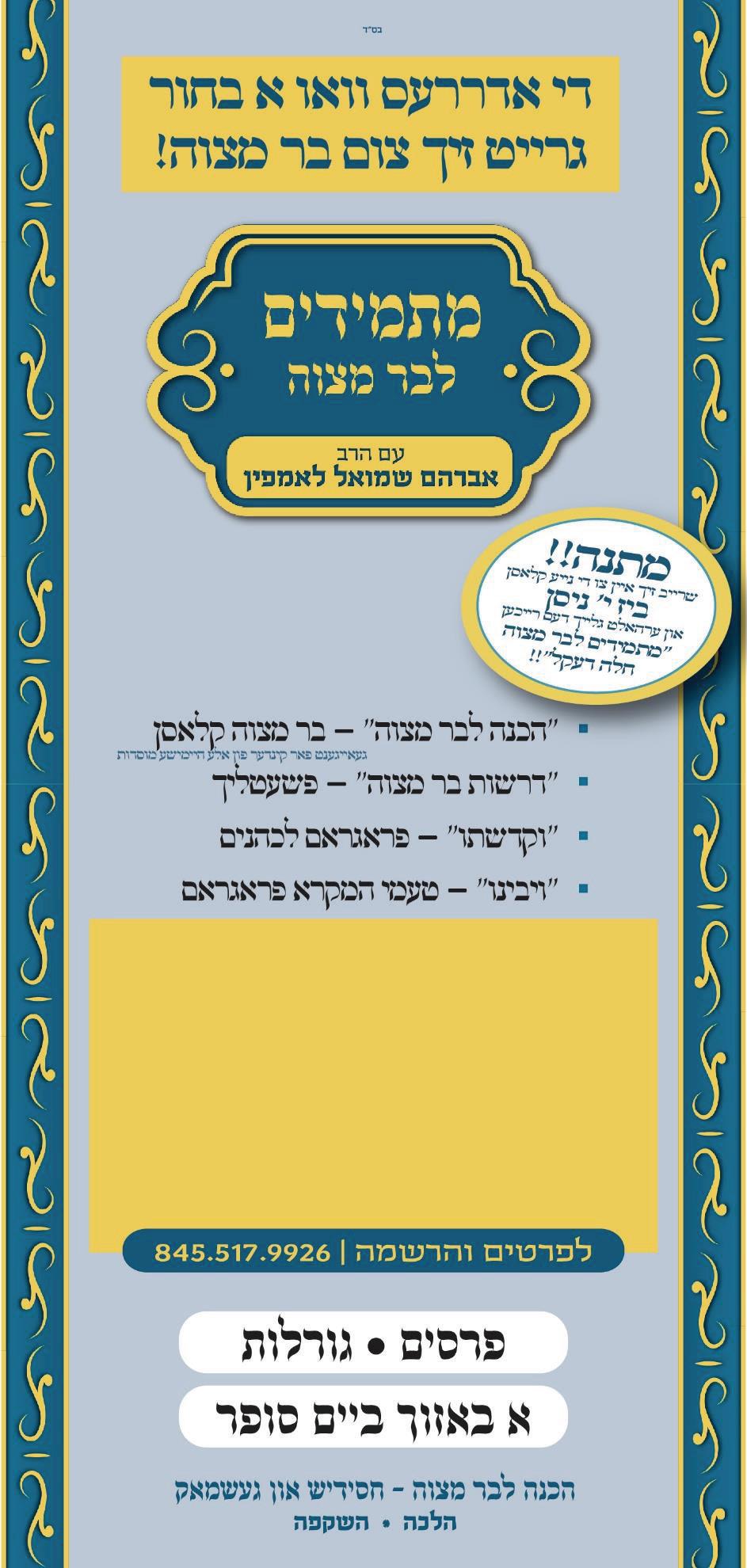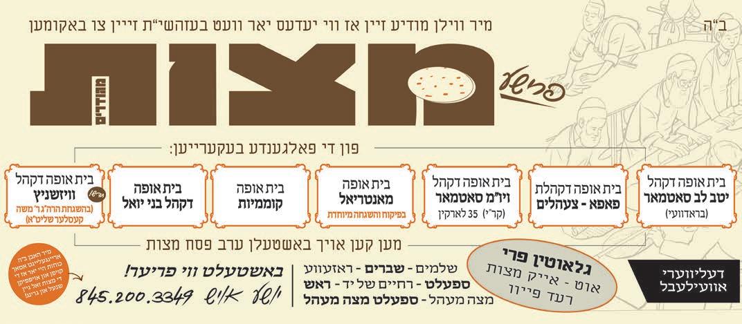םיאנ םילכב הפי ונחלש רדסי ב”עת ןמיס םייח חרוא ךורע ןחלש Receive a beautiful white gartel with every Pesach silver purchase. Sitat the Seder withreal malchus Monroe: 845.774.8468 51 Forest Rd. | Lakewood: 732.994.2833 1328 River Ave. Text or email to order and have it delivered: 845.774.8468 | info@heritagesilver.com