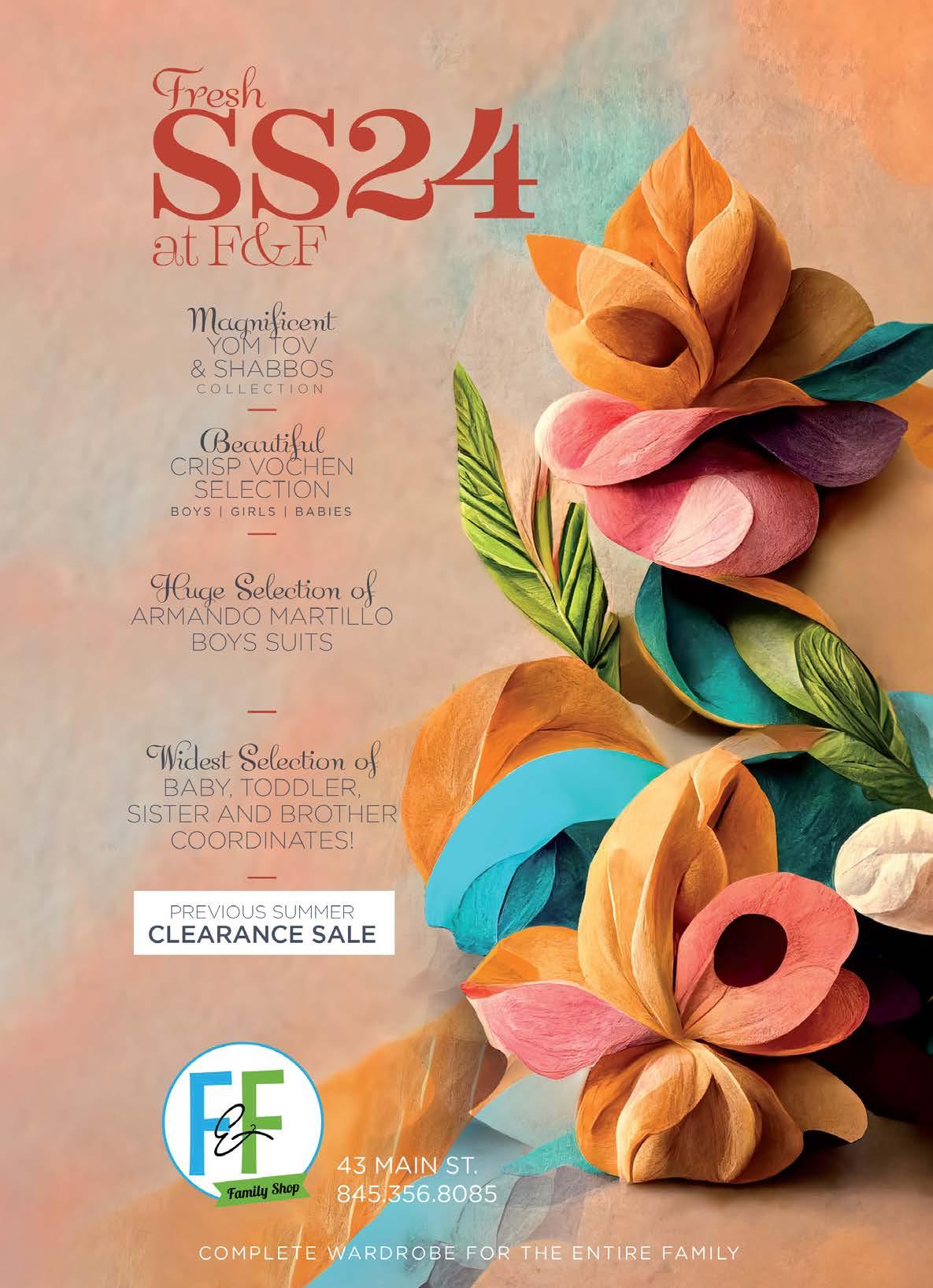 Styled for Mommy. Priced for Daddy. BORO PARK 3813 13TH AVE 347•663•7999 SUN-TH 10:30-6:30 FRI 10:30-1 MONSEY 401 W RT. 59 • AT THE ATRIUM PLAZA 845•459•6112 SUN-TH 10:30-6:30 • FRI 10:30-1 LAKEWOOD AMAZING SAVING SHOPPING PLAZA 732•250•4140 SUN-TH 10:30-6 • FRI 10-1 SS 24