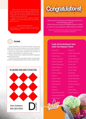 When you’re done with the dining room, you are really just a few steps away from being done with your Pesach cleaning. Only a few rooms left. So, the long awaited two-day getaway? You can so do it now. Please do not tell your husband, shvigger, neighbor, or any sane friend that you got this idea from me. Catch you next week, Sara Sara Goldstein is a professional Organizer serving Upstate, Brooklyn and Beyond.