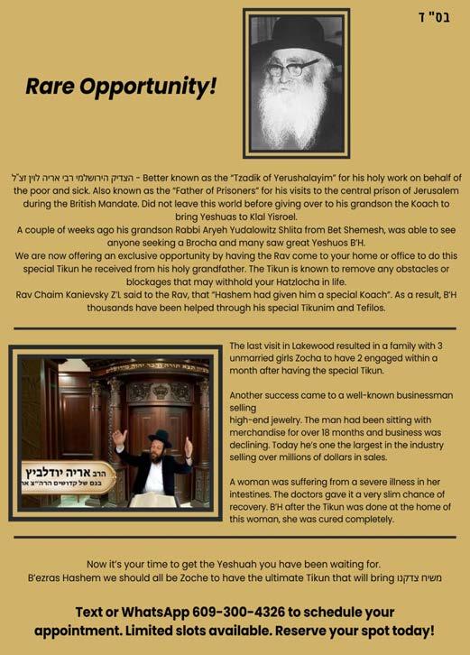The renowned Rebetzin Aidel Miller from Yerushalayim will remove Ayin Horah over the phone. Call till 5:00 PM: 718.689.1902 or 516.300.1490