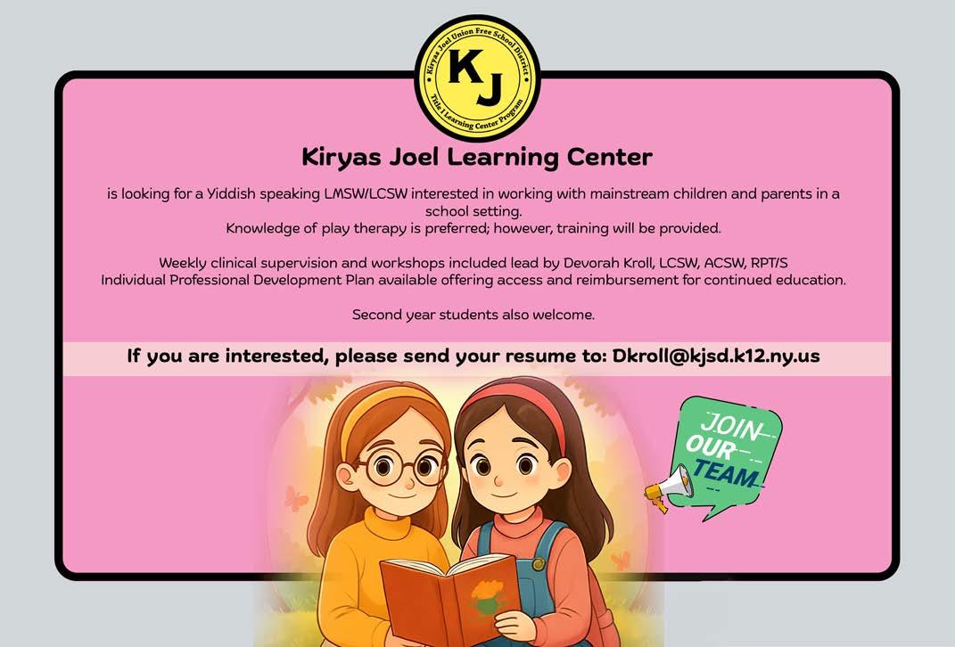 Very experienced Kitah alef teacher. Yiddish and English speaking. Leave message at 845-425-8046