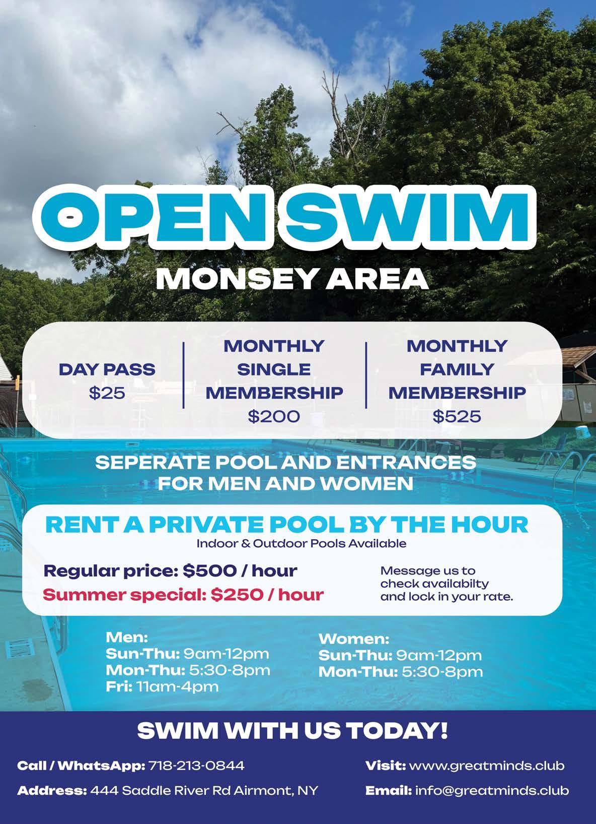 Large, heated, sparkling, w/ waterslide, dressing rooms & restroom. Open for ladies Sun 9-3, Mon-Thurs 9-6, Fri 9-2. 347 526 0615