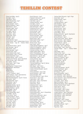 Ruchy Schwartz - Age 8 Tziporah R. Schwartz - Age 10 Raizel Leah Katz - Age 8 Volvi Brief - Age 12 Yehuda Leib Brief - Age 6 Tzivi Spira - Age 10 Ezriel Hochhauser - Age 12 Esty Hochhauser - Age 9 Mordechai Ehrman - Age 8 Nuchem Ehrman - Age 6 Bruchy Sandel - Age 7 Sarah Sandel - Age 9 Shimon Sandel - Age 6 Shimon Dancziger - Age 5 Avrumy Farkas - Age 11 Shaye Farkas - Age 5 Zeida Yaakov Farkas - Age 7 Miry Farkas - Age 9 Shmily Amsel - Age 6 Isaac Amsel - Age 8 Yaakov Shulem Klagsbraun - Age 7 Naftali Tzvi Klagsbraun - Age 10 Mordechai Klagsbraun - Age 12 Yitzchok Lichtman - Age 11 Moshe Yaakov Pollak - Age 8 Esther Weichselbaum - Age 9 Chananya Weichselbaum - Age 11 Beily Feferkorn - Age 10 - Belz Zeldy Berger - Age 11 - Skver Aharon Herzog - Age 8 Dina Bloch - Age 8 - Belz Sury Bloch - Age 7 - Belz Yitzchok Goldenberg - Age 10 - Satmar Leible Herczl - Age 9 Gitty Berger - Age 7- Skver Yisroel Chaim Pollak - Age 10 Yaakov Yitzchok Schapira - Age 10 Yanky Mayer Temmy Kornbluh - Age 5 - Belz Sura’le Feferkorn - Age 7 - Belz Rachy Kornbluh - Belz Tzvi Hirsch Shulman - Age 6 - Skver Perela Herczl - Age 9 - Blez Yossi Lebron - Age 7 - Belz Shifra Adler - Age 11 - Bais Rochel Reizy Binik - Age 12 Heshy Binik - Age 8 Mordechai Binik - Age 7 Tziri Rothenstein - Age 7 Zishe Roth - Age 12 Leiby Kohn - Age 9 Refoel Stessel - Age 9 Mendy Rothenstein - Age 4 - Klausenberg Yehuda Kohn - Age 7 Chaya Frimy Rothenstein - Age 6 Shimon Rottenstein - Age 10 Shmuel Hersh Illiovits - Age 6 Shiffy Eisenberg - Age 11 Chaya Wieder - Age 11 Elimelech Wieder - Age 10 Avrum Shloma Wieder - Age 7 Betzalel Wieder - Age 6 Bashy Wieder - Age 7