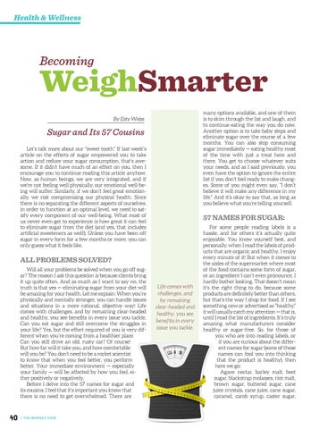 Sugar and Its 57 Cousins Let’s talk more about our “sweet tooth.” If last week’s article on the effects of sugar empowered you to take action and reduce your sugar consumption, that’s awesome. If it didn’t have much of an effect on you, then I encourage you to continue reading this article anyhow. Now, as human beings, we are very integrated, and if we’re not feeling well physically, our emotional well-being will suffer. Similarly, if we don’t feel great emotionally, we risk compromising our physical health. Since there is no separating the different aspects of ourselves, in order to function at an optimal level, we need to satisfy every component of our well-being. What most of us never even get to experience is how great it can feel to eliminate sugar from the diet (and yes, that includes artificial sweeteners as well!). Unless you have been off sugar in every form for a few months or more, you can only guess what it feels like.