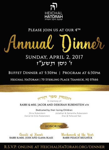 Buffet Dinner at 5:30pm | Program at 6:30pm Heichal HaTorah | 70 Sterling Place Teaneck, NJ 07666