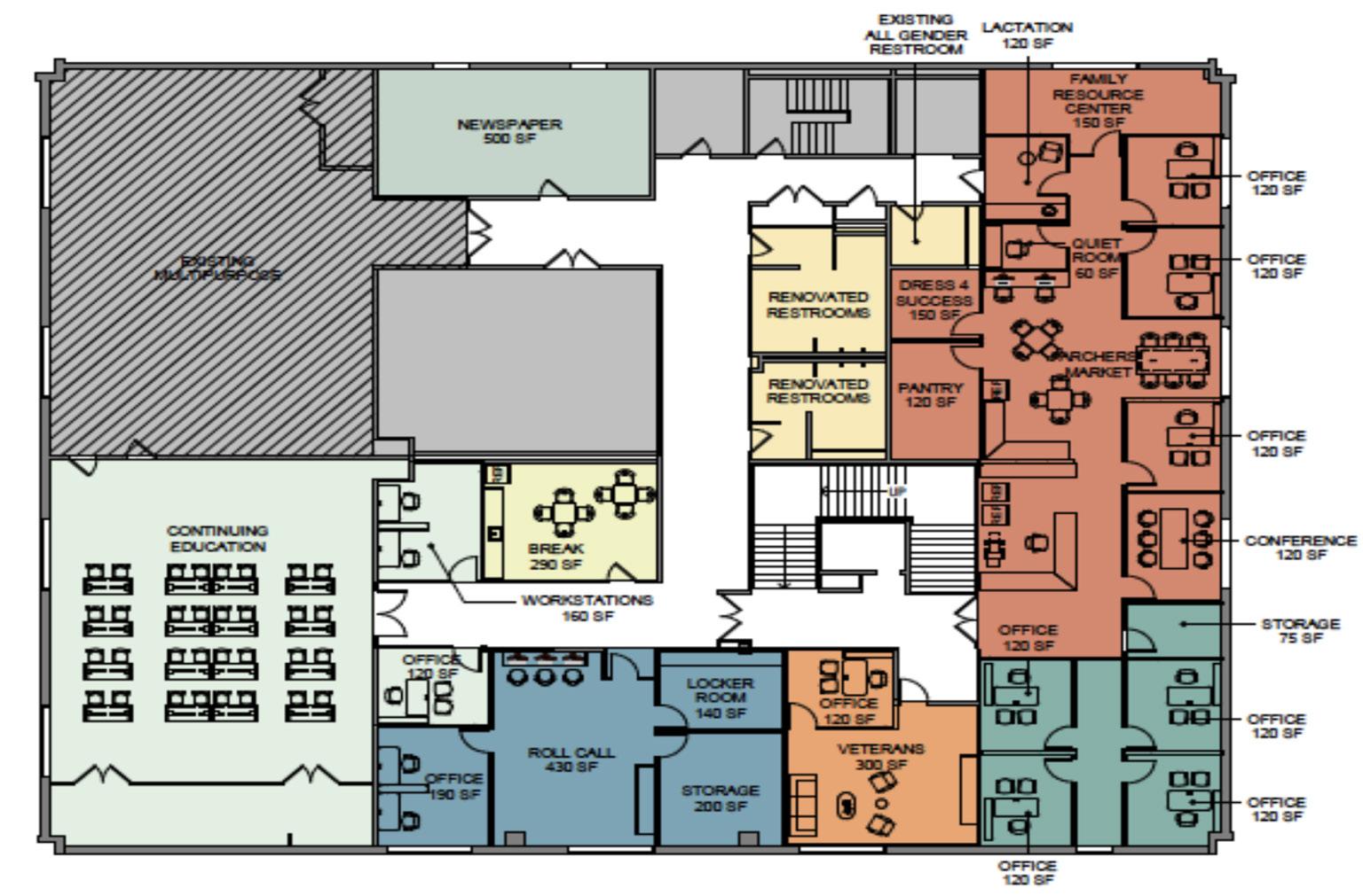 In addition to those changes, it appears that Campus Police will also find a new home within the Student Center, with a new substation on the first floor and what appears to be new offices in the old TRIO space on the Second Floor. The Veterans Services Department and Counseling Offices also appear to have new offices on the second floor, and the walls that currently separate The Montage and Campus Life rooms will be knocked down to make new facilities for the Student Advocacy & Resource Center (SARC). Continuing Education, currently housed in a structure on Couch Avenue, will move into the space that is now Room 201 on the second floor.