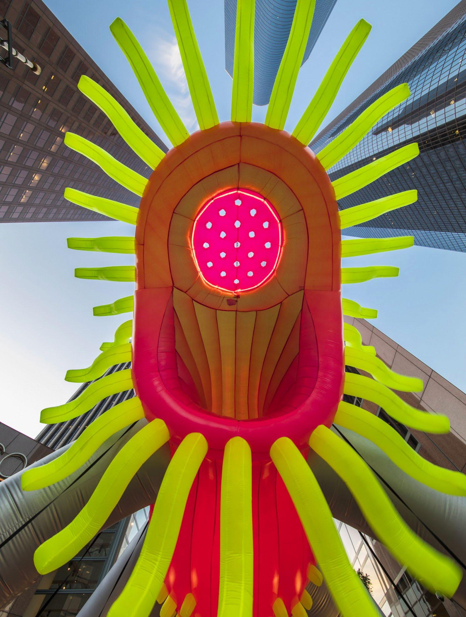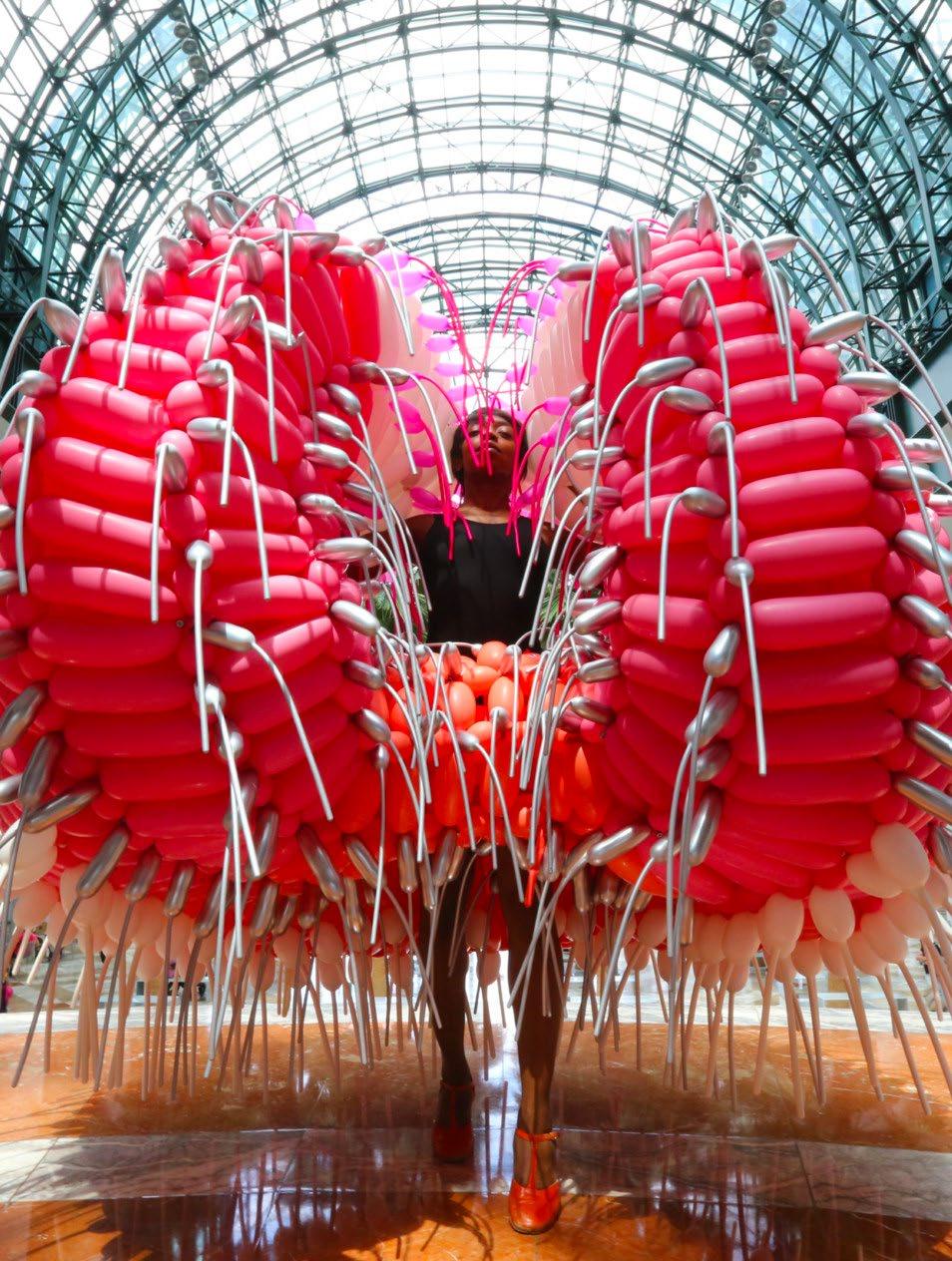American artist Jason Hackenwerth combines the same balloons found at amusement parks in a most unusual way, from wearable art and dragons with flaming tongues to monumental blooms. His vast repertoire mimics a zoo of gigantic insects or a greenhouse filled with unknown vegetation. Hackenwerth has even created an “airy” wardrobe for a dance team, and many of his exhibitions include performers twirling around his chromatic balloon sculptures. L’artista americano Jason Hackenwerth realizza inusuali composizioni di palloncini gonfiabili, quelli standard che si acquistano ai Luna Park. Possono essere sculture da indossare, draghi dalle lingue infuocate, improbabili grandi fiori. Il suo variegato repertorio assomiglia a uno zoo che accoglie sconosciuti giganteschi insetti, oppure a un parco dove crescono nuove specie vegetali. Ha creato persino costumi di palloncini per un corpo di ballo. Molte sue performance prevedono anche danzatrici che fanno volteggiare le sue sagome, create assemblando palloncini multicolori.
