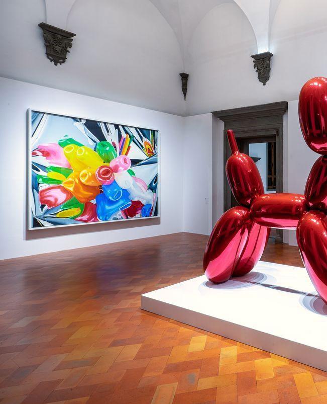 The exhibition is an evocative dialogue between stark, historic architecture forged of solid stone and Koons’ ironic, ludic, colorful balloon sculptures