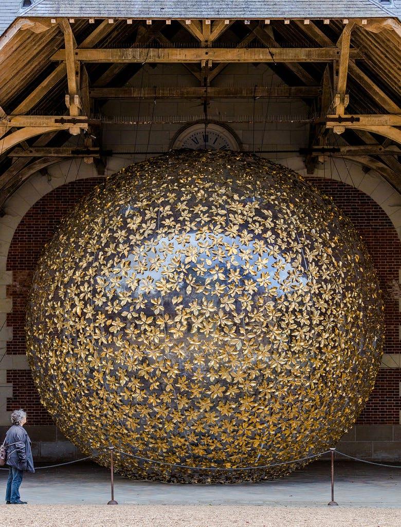 « En plein midi », 2018, bamboo sculpture with 1100 sheets of zinc sheet painted with gold, diameter: 6.20 m, Center d’Arts et de Nature, Domaine de Chaumont-sur-Loire