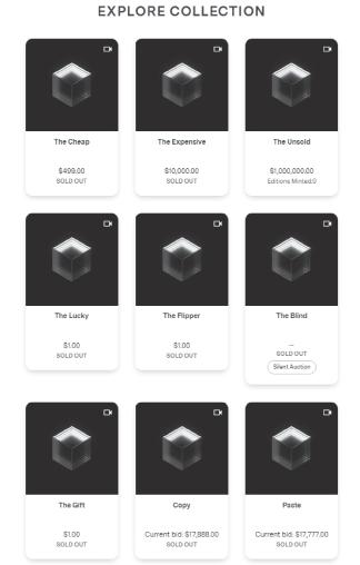 The Fungible Collection – the more unique part of the auction –had six groups of NFTs available that were each delivered based on diferent outcomes. For example, The Cube NFT was delivered to the owner of the most Open Edition NFTs at the end of the 3-day auction period (each period ran for only 15 minutes each day). The Equilibrium was granted to 4 users – for solving a puzzle, reaching the biggest audience, etc. The other requirements can be seen by clicking each item here. With these mechanisms, Pak created scarcity, hype, metagaming, reasons to buy more Cubes, and more – all in a three-day auction period, with tiny purchasing windows. The sale raised a total of $16.8m.