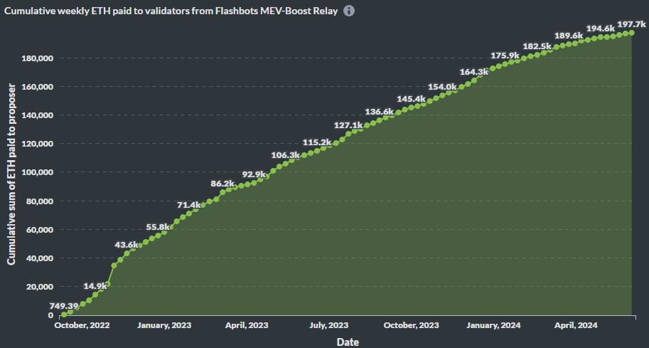Cumulative Weekly ETH paid to Validators from Flashbots Relay- MEV Explorer.