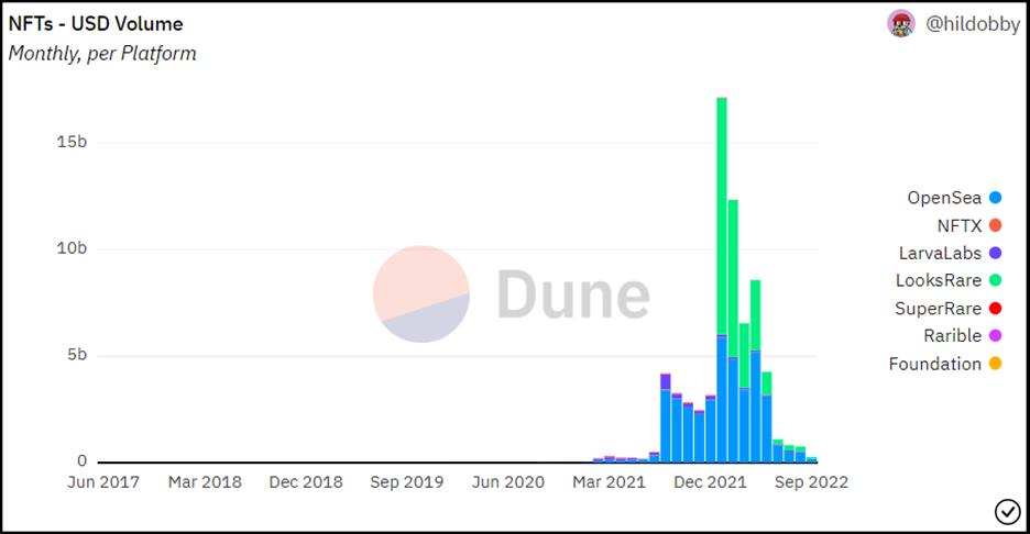 NFTs have experienced mainstream acceptance, with Justin Bieber, Eminem, Snoop Dogg and more buying Bored Ape Yacht Club (BAYC) NFTs. The following charts show the monthly USD volume and daily transaction count to date from the most popular NFT marketplaces.