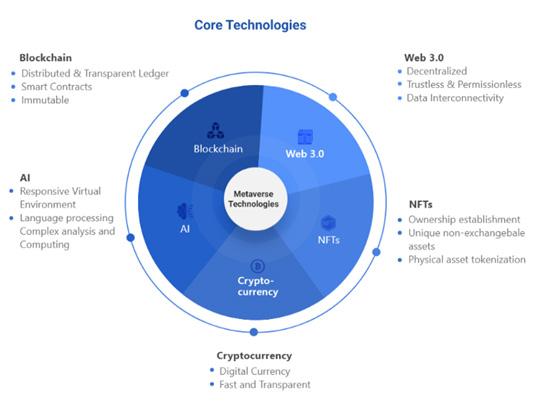 These facilities reside on the technologies that drive the Metaverse called Core Technologies: Blockchain, Web3, NFTs, Cryptocurrency, and AI, currently facilitating the enablers to lay the foundations for the Metaverse complex structure, which allows its economy to function.