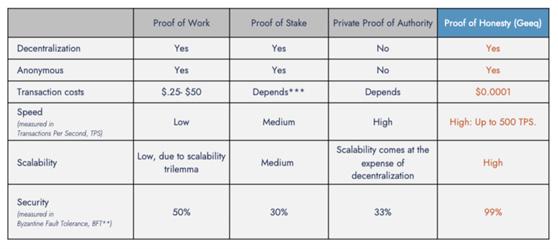 Geeq is a multi-chain blockchain and application-agnostic platform with no main chain. It comprises an ecosystem of custom blockchain applications, each with its specific network of permissionless validation nodes. Geeq runs on a proprietary consensus mechanism called Proof of Honesty (PoH), in which each individual validator has a set of rules that determine whether the transactions they validate are valid. These sets of rules are undeniable, meaning that if every agent on the network agrees with each other, it’s because they individually applied the PoH set of rules.