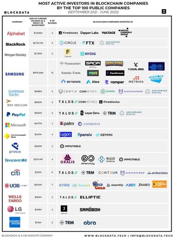 From September 2021 to June 2022, at least 40 corporations invested in companies in the blockchain/ crypto space during this time. Of these 40 corporations, Samsung has been the most active with 13 investments, as reflected by Blockdata data at the end of Q3 2022.
