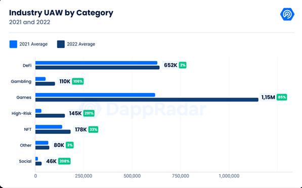 According to data from DappRadar’s latest report, in 2022, games averaged 622,620 dUAW. This number grew by 85% in 2022, reaching just over one million dUAW (unique active wallets) on average.