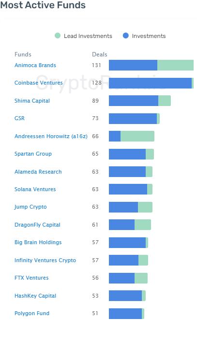 Cryptorank data indicates that Coinbase Ventures has led nine investment rounds out of 128 over the last year to become the second-largest crypto fund in the ecosystem below Animoca Brands.