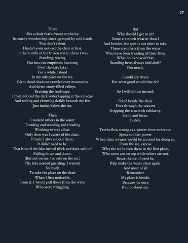 Then I noticed others in the water Treading and treading and treading Working to stay afloat. Truths flow strong as a winter river under ice. Only then was I aware of the chair. Speak to their power It hadn't always been there, When their owners would be scorned for doing so. It didn't need to be. From the ice, expose That is until the lake turned thick and dark with oil Why the ice is even there in the first place, Pulling down and down. Why some are on top while others are not. (But not on me. I'm safe on the ice.) Break the ice, if need be. The lake needed guarding. I wanted Help make the water clean again. So much And most of all To take the place on the chair Remember When I first noticed it. My place is beside. From it, I would pull those from the water Because for once Who were struggling. It's not about me.