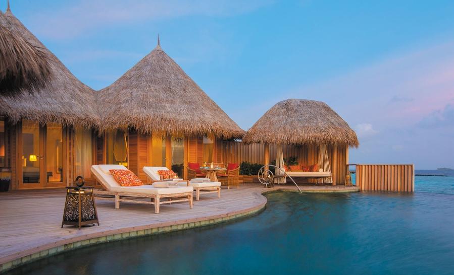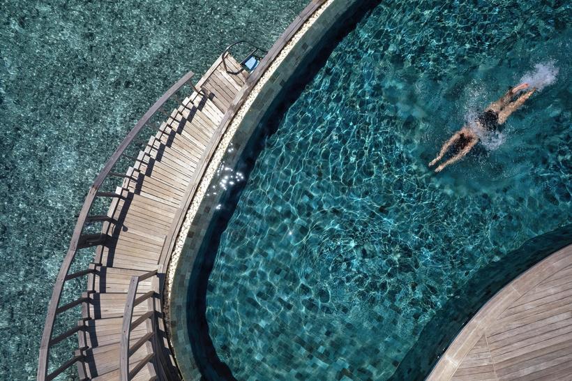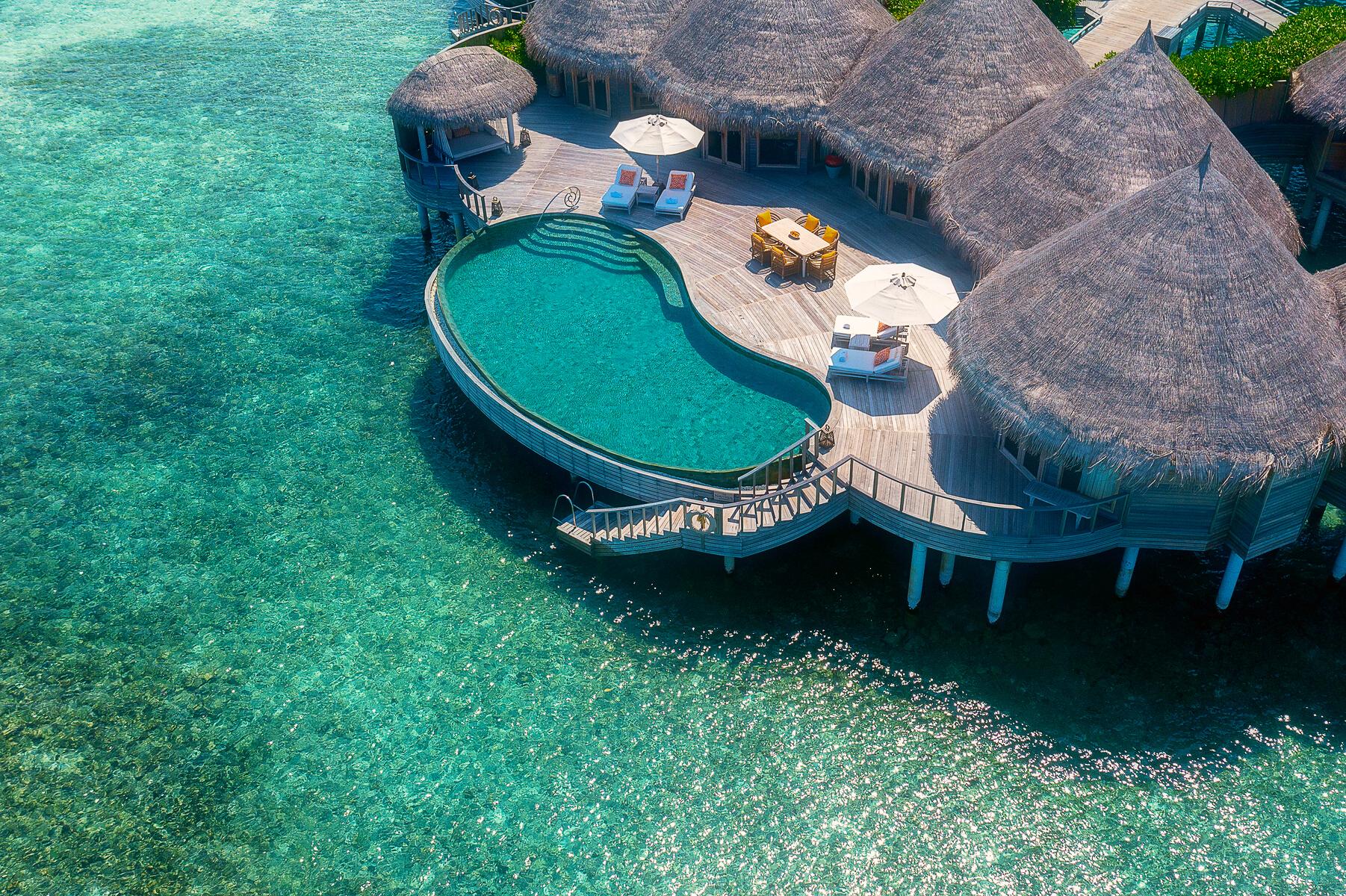 These secluded ocean houses for two embrace overwater life in exceptional style. Perched in the middle of a turquoise lagoon, a poolside sun deck stretches out to the horizon, with steps spiralling down to the seawaters below.