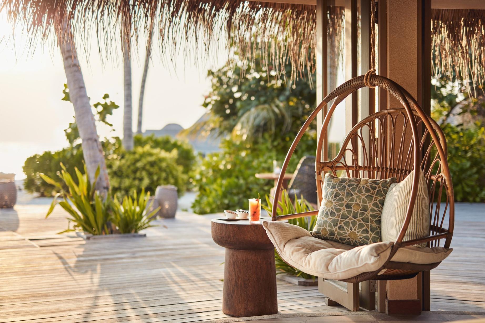 Natural and organic designs mix with geometric and mandala-inspired patterns –always emphasizing the colour theme of their particular location, and reinforcing the overriding bohemian vibe. While area rugs at selected public pavilions depict combine elaborate mandala patterns with intricate macramé techniques, the reef-inspired designs are featured on all carpet designs. Those at the over-water residences provide a visual connection in a more literal manner, with oval cut-outs over a viewing glass in the sitting room’s floors, framing views of the lagoon below.