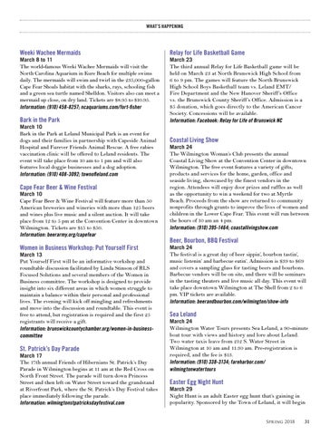March 24 Wilmington Water Tours presents Sea Leland, a 90-minute boat tour with views and history and lore about Leland. Two water taxis leave from 212 S. Water Street in Wilmington at 10 am and 11:30 am. Pre-registration is required, and the fee is $13. Information: (910) 338-3134; fareharbor.com/ wilmingtonwatertours
