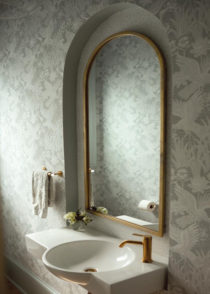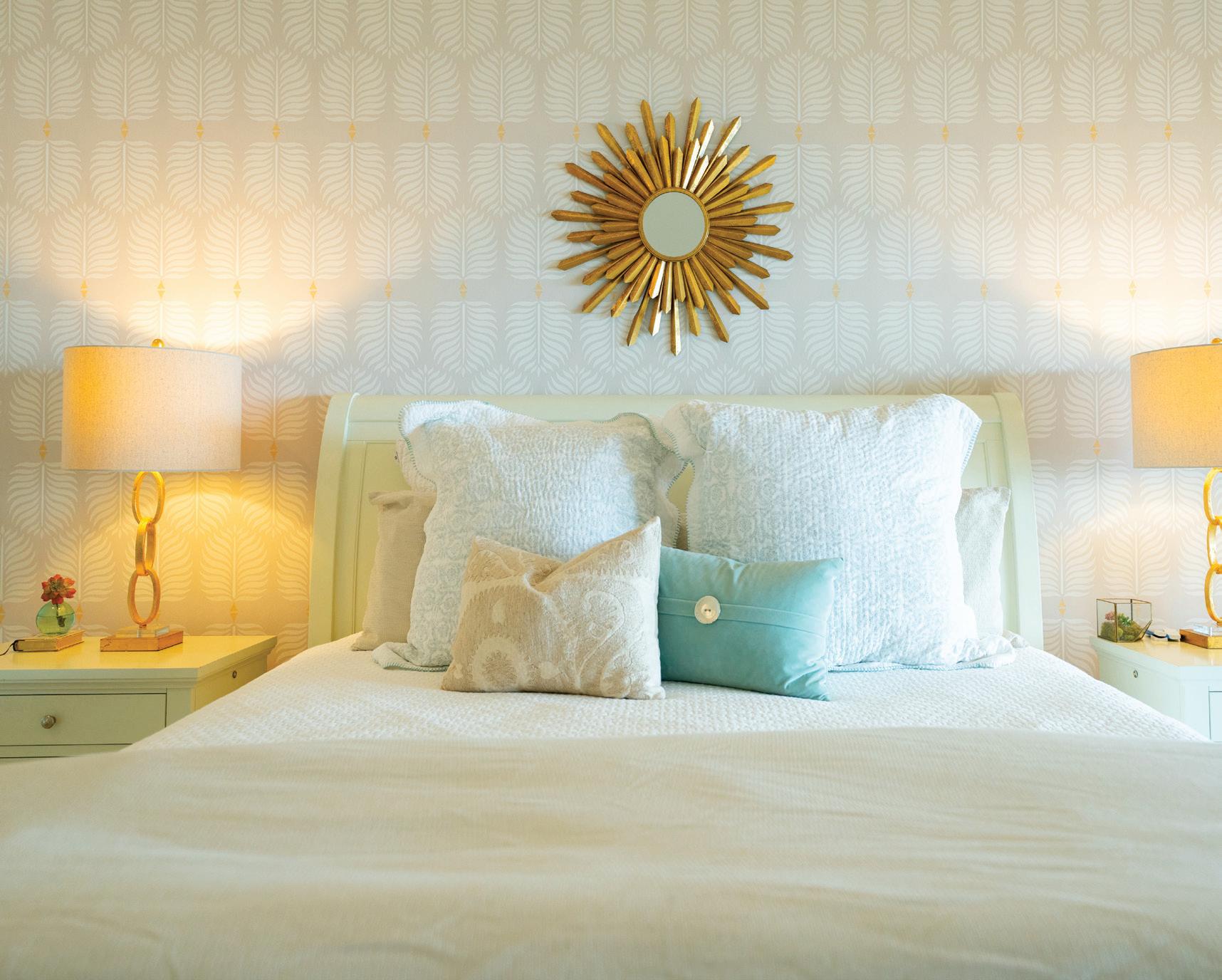 “They are compatible patterns, but not the same. We painted the trim and shutters the same color that ties in the wallpaper so it created this really pretty encapsulating look and you forget about the narrowness,” Satterfield says.