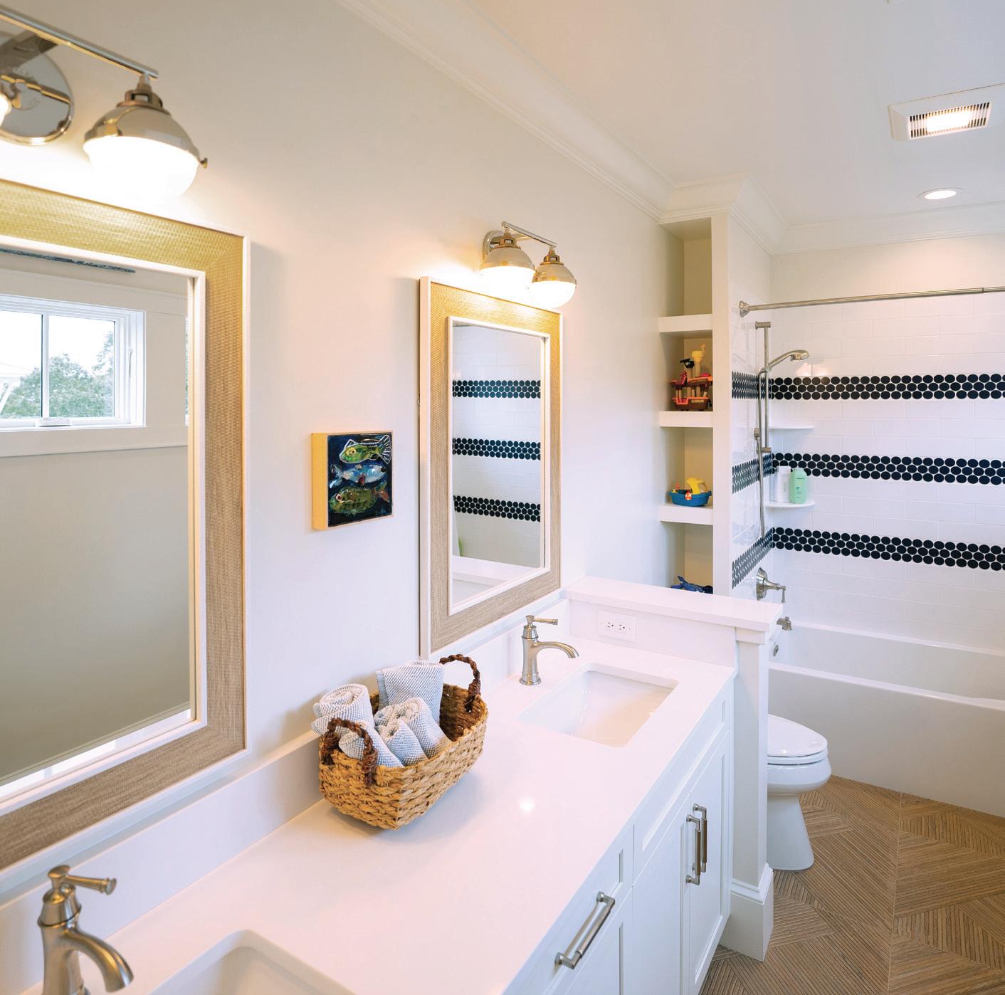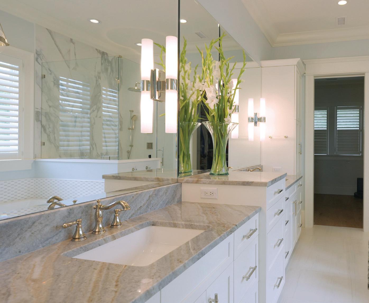 “It was a challenge, a fun challenge, but a challenge because it was long and narrow. Even a pedestal sink would have been tight. We ended up creating a niche in the wall, had the vanity suspended to sit within the niche, and did a pretty arch over the top,” says Satterfield.