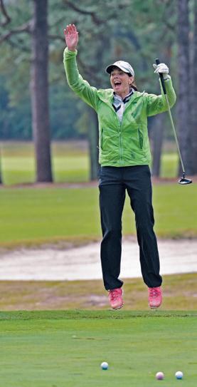 Above, left: Celebrating a Salvation Army Golf Tournament putt-off at Cape Fear Country Club in 2018 are Lana Winneberger and Susan Price. Above, right: Tournament chair Bobby Benson and former Salvation Army board president David Price present the inaugural tournament check to Major Richard Watts in 2011.