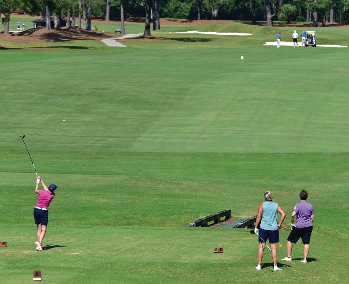 Above, left: Robert Kidder, Mike Anderson and Mark Citrella chipping to the green on the fifth hole during the 2017 Salvation Army Golf Tournament at Cape Fear Country Club. Above, right: Sheila Bowles and Betsy Miles watch Carla Daniels teeing off at the sixth hole at the 2019 Salvation Army Golf Tournament.