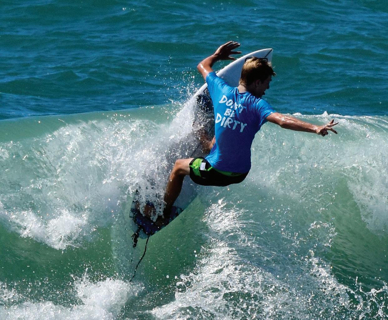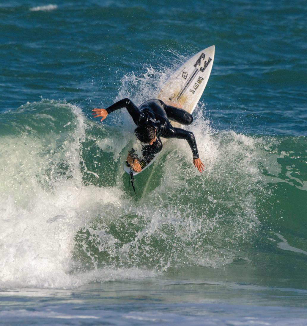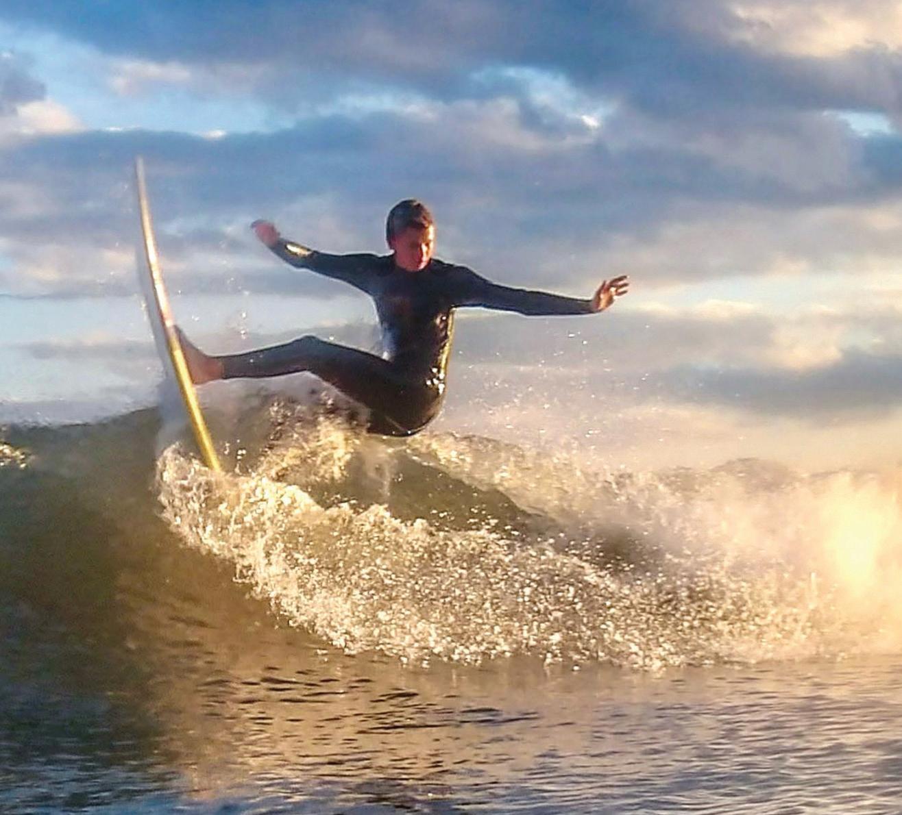 Finn Viorel, age 16, makes a nice turn as he catches a wave during an afternoon surf session south of Johnnie Mercers Pier in March 2024. Viorel first surfed with his dad when he was 5, but took up the sport for real when he was 10.
