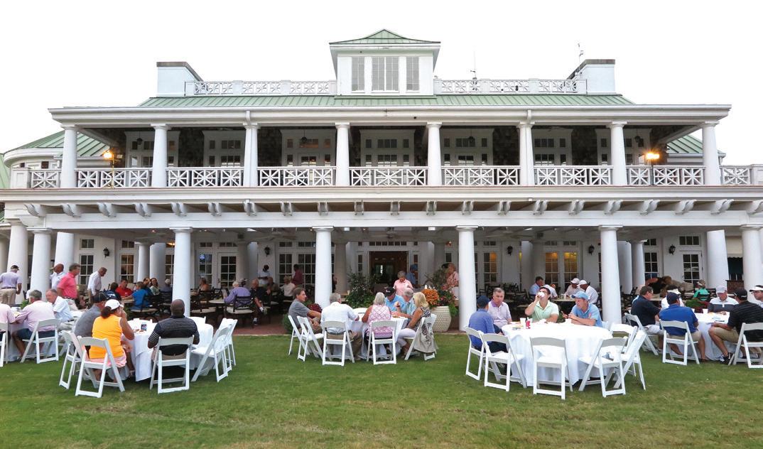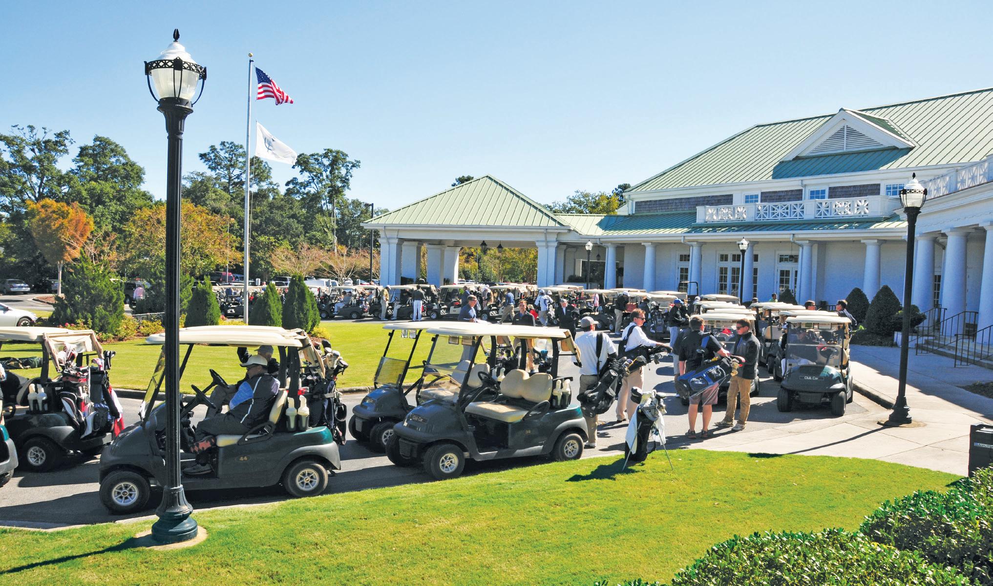 Top, right: William Robison, Ben Riley and Franklin Boney watch as Drew Kaley chips onto the 13th green at Cape Fear Country Club (undated). Right: Salvation Army Golf Tournament participants enjoy dinner and refreshments at Cape Fear Country Club (undated). Below: Teams and carts line up for the fifth annual Salvation Army of Cape Fear Golf Tournament at Cape Fear Country Club.