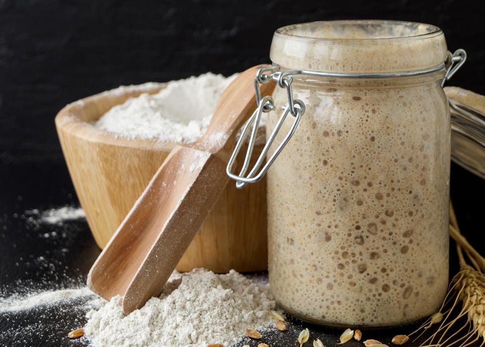 When there is an abundance of bubbles and the starter has doubled in size, it is time to bake. The texture should be fluffy and spongy, perfect for kneading. Two recommended supplies for