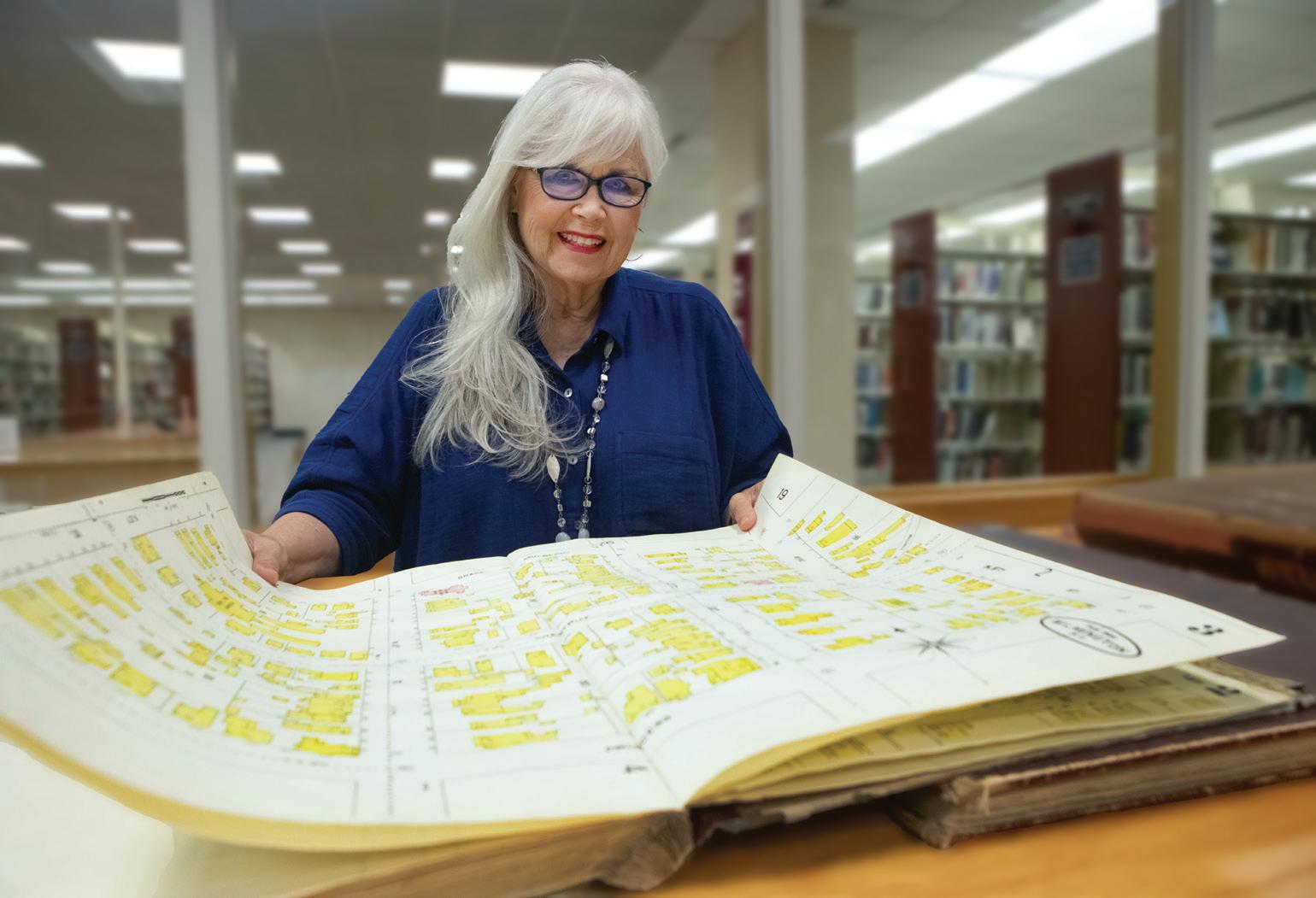 Pat Bradford examining a book of Wilmington city maps from the 1700s in the North Carolina History Room of the New Hanover County main library on Aug. 10, 2024.