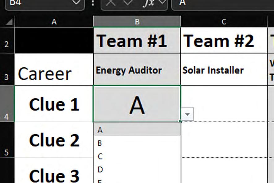 This spreadsheet is a useful, Excel-based computer file built to aid in the revealing and displaying of clues for game play. It is necessary if opting to create a custom set of careers for game play. The spreadsheet contains separate tabs to input student clue choices for projecting, an answer key, and is pre-formatted to hide and unhide information as needed. Download the spreadsheet at https:// www.need.org/wp-content/uploads/2025/04/Energy-Career-Enigma-Spreadsheet-1.xlsx