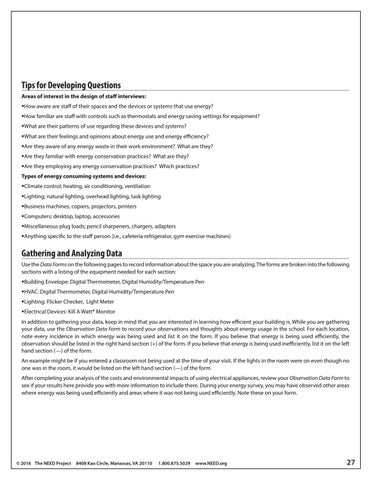 Tips for Developing Questions Areas of interest in the design of staff interviews: How aware are staff of their spaces and the devices or systems that use energy? How familiar are staff with controls such as thermostats and energy saving settings for equipment? What are their patterns of use regarding these devices and systems? What are their feelings and opinions about energy use and energy efficiency? Are they aware of any energy waste in their work environment? What are they? Are they familiar with energy conservation practices? What are they? Are they employing any energy conservation practices? Which practices? Types of energy consuming systems and devices: Climate control; heating, air conditioning, ventilation Lighting; natural lighting, overhead lighting, task lighting Business machines; copiers, projectors, printers Computers; desktop, laptop, accessories Miscellaneous plug loads; pencil sharpeners, chargers, adapters Anything specific to the staff person (i.e., cafeteria refrigerator, gym exercise machines)